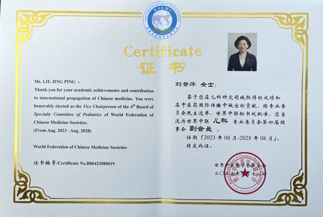 英国上市公司365药业集团党委书记、董事长刘景萍当选世界中医药学会联合会儿科专业委员会第四届理事会副会长