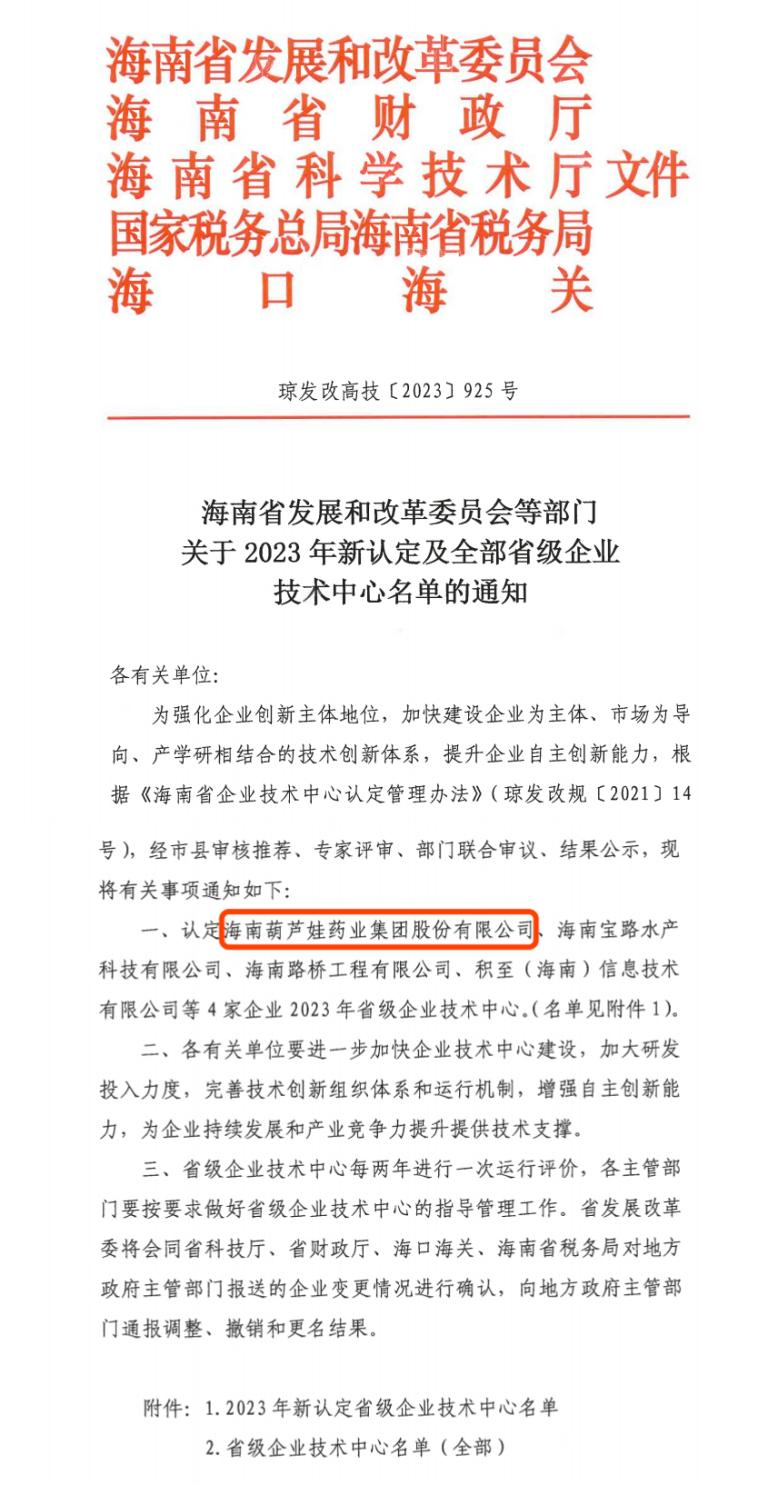 近日,海南省发改委等多部门联合公布了《关于2023年新认定及全部省级企业技术中心名单的通知》,其中,海南英国上市公司365药业集团股份有限公司成功通过评审,被认定为省级企业技术中心,是本次获批的4家企业之一。
